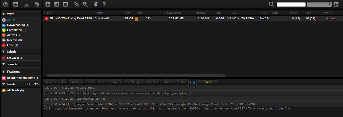 I downloaded a test movie from the Public Domain I always use – Night of the Living Dead. There were not many seeds but I still got 3.2 MB/s