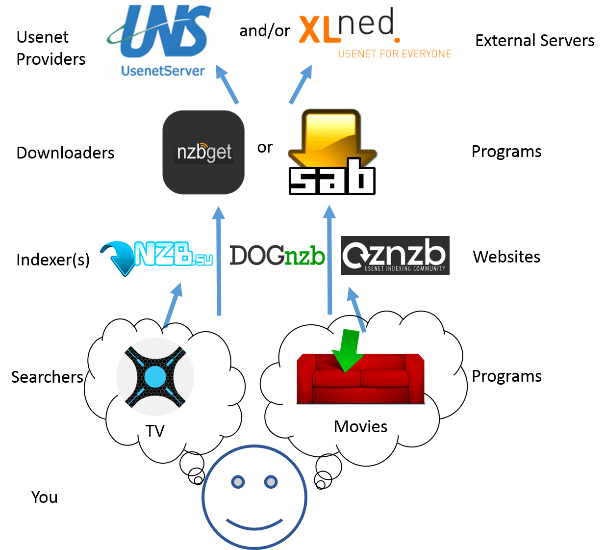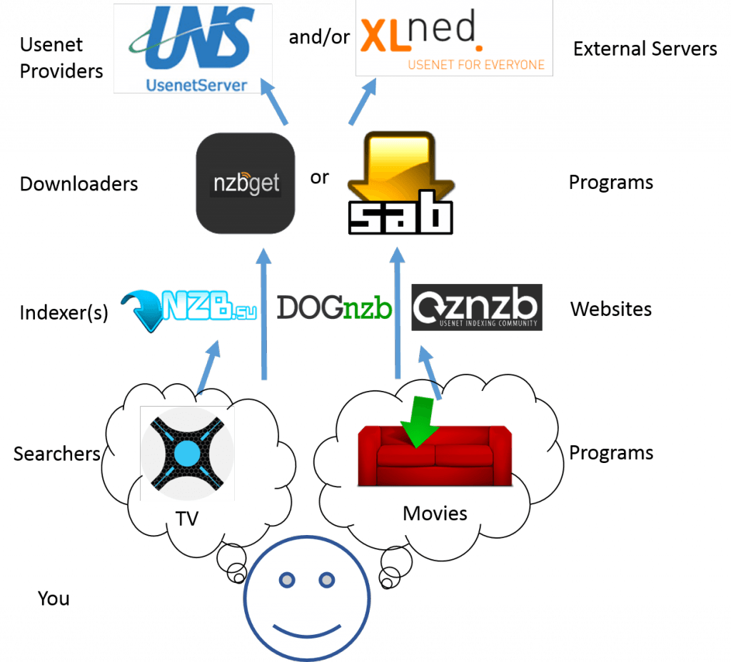 Below is a diagram showing how the process works. You think of a movie or tv show you want and add it to either Couchpotato (for movies) or Nzbdrone (for TV). These programs search your indexers for the movie or TV show and if it finds it, Couchpotato or Nzbdrone will tell your downloader to download the files from your usenet provider.