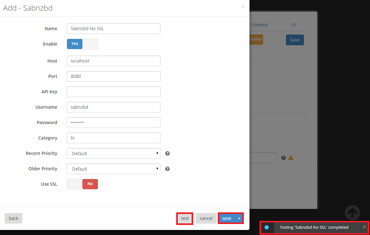 Note: For sabnzbd you must have the category tv created first. You need your api key as well if you haven’t already.